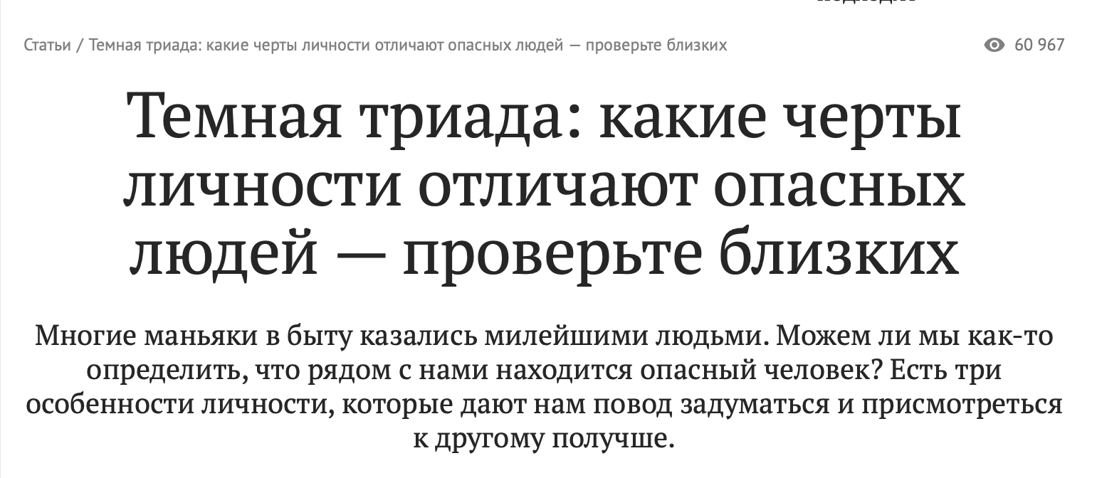 А постоянная тревога серьёзно снижает эмоциональную устойчивость, самооценку и критическое мышление. Поэтому эволюция берёт верх над критическим мышлением: девушка обращает внимание на сильного, красивого, агрессивного мужчину. А через пару месяцев он оказывается мудаком.